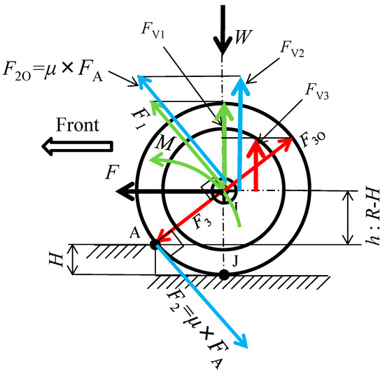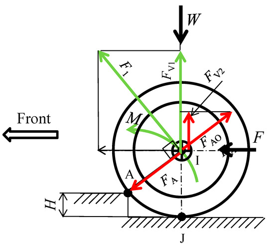 Figure 27 shows the balance of local forces that occur when a wheel encounters point A. Just like a driven wheel, when a wheel encounters point A, a rotational moment M (shown in green) is generated that rotates point I counterclockwise around point A. This causes a diagonal upward forward force F1 to act on point I. The vertical component of F1 is FV1. When the wheel encounters the curb, a frictional force F2 (blue) acts in the tangential direction of point A on the wheel, and the reaction force F2O acts on point I. The vertical component of this force is FV2. When the wheel encounters the curb, a force F3 (red) acts from point I towards point A, and the reaction force F3O acts on the wheel point I. The vertical component of this force is FV3. When the sum of FV1, FV2, and FV3 exceeds the driving wheel load W, the wheel will be able to overcome the curb-climbing task. To make it easier to overcome a curb, increase the difference between the tire radius R and the curb-climbing height H. Increasing the propulsive force F and reducing the wheel load W are ways to do this, as well as increasing the coefficient of friction μ between the wheel and the curb.