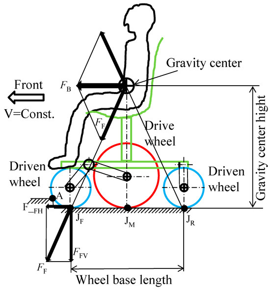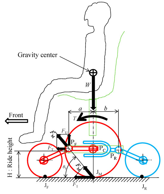 To explain Figure 25, the driving reaction force F1 of the motor driving wheel acting on the contact point JM acts on the pivot point PF of the front rocker link, and FM acts in the forward and upward directions. The vertical component FU of FM is divided into the front and center wheels by the inverse of the ratio of dimensions c and d, and acts on each of them. This reduces the W of the front and center wheels, which is advantageous for the front wheels’ ability to overcome curb climbing. For example, the torque of the motor is greatest at startup. Therefore, by bringing the front wheels into contact with a curb and moving forward from a stationary state with maximum acceleration force, it is possible to contribute to an improvement in the front wheels’ ability to overcome curb climbing.
