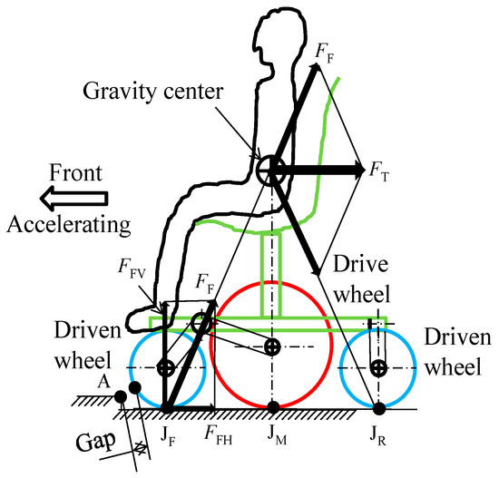 Next, consider F and W when a wheelchair accelerates from a stationary state. Figure 24 shows how the force FT acting on the center of gravity when the wheelchair accelerates acts on the front wheel, which is the driven wheel. The vertical component FFV and horizontal component FFV act on the front wheel contact point JF. The vertical component FFV acts upward and reduces the wheel load W of the driven wheel. The horizontal component FFH is generated in the backward direction and reduces the propulsive force F.