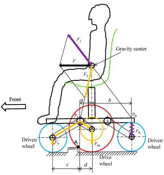 Next, we will examine the effect of the inertial force generated when the drive wheels of an electric wheelchair encounter curb-climbing when going over a curb. Figure 28 shows the change in wheel load of the drive wheels due to the inertial force F in the conventional chassis shown in Figure 8. The inertial force F indicated by the black arrow acts on the front rocker arm pivot points PF and PR directly above the coil spring. The downward force F2 indicated in green acts on the front pivot point PF, and the upward force F1 acts on the rear pivot point PR. As a result, a downward force acts on the center wheel and front wheel, increasing the wheel load W of both. In the case of the conventional type with dimension c > d, the increase in wheel load of the center wheel is significantly large, which is detrimental to going over curbs.