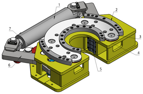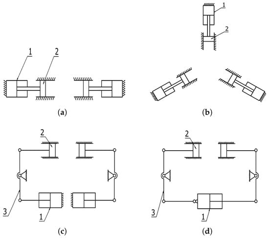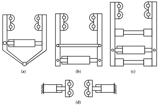 Figure 5c illustrates the linkage of the double-hydraulic-cylinder drive, which can provide a larger clamping force through the lever structure. The structure’s various forms can be adapted to different occasions, but the disadvantage is that the structure is more complex and occupies more space.