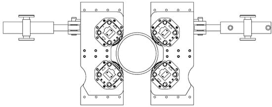 Given the comprehensive features and advantages and disadvantages of the above structures, and taking into account that the iron roughneck designed in this paper is a clamping–spin buckle body structure, the parallel clamping structure with double hydraulic cylinders is chosen as the design of the spin buckle mechanism, whose structure is shown in Figure 3, and the clamping schematic diagram of the drilling tool is shown in Figure 4.