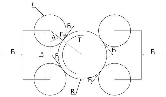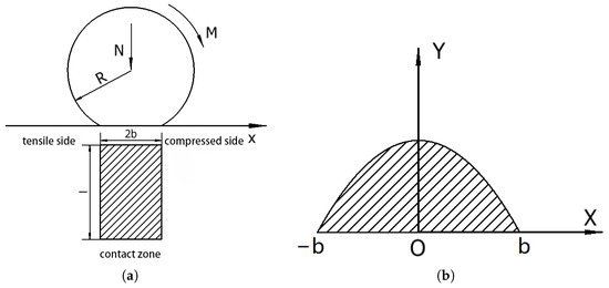 As can be seen from Figure 14, the cylinder undergoes rolling in the positive direction along the x-axis, the radius of the cylinder is R, and the material on the front side, which is in the direction of motion, is squeezed, while the material on the other side is stretched. According to Figure 14b, the pressure on the microelement at the x position in front of the contact region is p, and the resistance generated by the pressure p around the normal of the contact region should be pdx; then, the total resistance moment M in the first half of the region is: