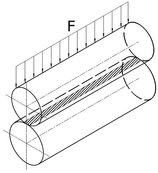 The type of contact between the iron driller’s spinning buckle roller and the drilling tool can be regarded as a two-dimensional curved body line contact, and the contact situation is shown in Figure 11. F is the external force acting in the plane where the axes of the two cylinders are located, and the contact stresses are uniformly distributed along the axes on the contact area. Figure 12 shows a magnified view of the contact stress.