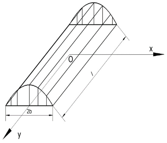 In Figure 11 and Figure 12, the contact region in the xOy plane can be seen; for the l × 2b rectangular region, b is the half-width of the contact region, l is the length of the contact region, and the entire stress distribution region in the xOz plane of the projection profile can be regarded as a half-elliptic quadratic curve. The origin of O is the center of the contact region, whence we have: