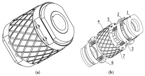 Schematic diagram of spinning roller structure: (a) fabrication. (b) exploded diagram. 1. threaded sleeve; 2. limit sleeve; 3. shroud; 4. friction ring; 5. roller shaft; 6. floating spring; 7. spring guide bar.