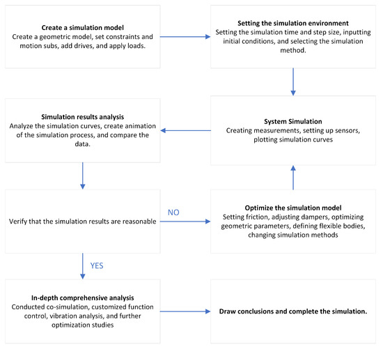 The simulation process can be summarized in two parts: modeling and solving. The modeling part includes the structural modeling of the geometric object. The physical modeling is based on the structural modeling to set the relevant physical characteristics of the object, the physical modeling of the connection relationship between the objects, or the relative motion relationship, as well as the mathematical modeling of the scalar setting of the relevant parameters or the control of the dynamic function [21,22]. The solution part is to analyze the changes in the performance parameters of the object in motion by applying different algorithms to the set the model through the integrator and solver of ADAMS. After several iterations of solving, the relevant curves and simulation animations are produced. After that, the simulation model can be further solved and analyzed by different function expansion modules [23]. The specific flow of the simulation is shown in Figure 17.