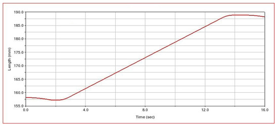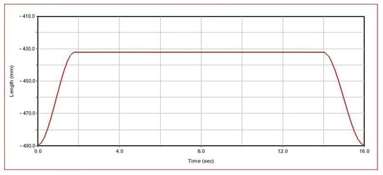 Figure 18 shows the applied translational driving curve. From the figure, it can be seen that under the control of the STEP function, the piston rod extends and gradually approaches the drilling rod in 0∼1.8 s, and the spin buckle roller contacts the drilling tool in 1.8 s. At this time, the piston rod extends the distance of 57.5 mm; after that, the spin buckle mechanism holds the drilling tool tightly, and the force of the piston rod is gradually increased. After 0.2 s adjustment, the spinning buckle mechanism keeps holding until 14 s, during which the spinning buckle roller starts to work; the spinning buckle completes its work at 14 s, and the thrust force of the piston rod gradually decreases within 0.2 s; the piston rod is withdrawn from 14.2 to 16 s.