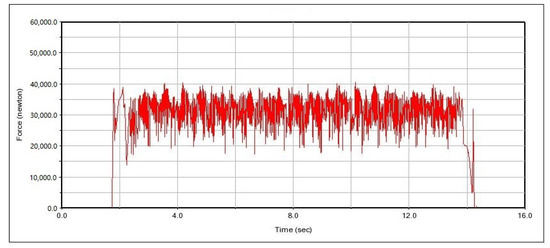 The size of the contact force between the spin buckle roller and the drilling tool directly affects the efficiency of the iron roughneck spin buckle work, which is an important factor. Rotary buckle work is a dynamic process, and the force between the dynamic rotating parts is unstable in the motion state. By analyzing the change in contact force, the vibration of the mechanism during the work can be speculated and the rationality of the design can be verified. Figure 20, Figure 21, Figure 22 and Figure 23 show the contact force curves between the four spin buckle rollers and the drilling tools obtained from the simulation experiments.