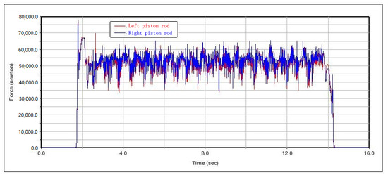 The force curve of the piston rod of the clamping cylinder is shown in Figure 24. According to the figure, we can see that the roller contacts the drilling tool at t = 1.8 s, the force of the two piston rods starts to increase at the same time, and the size of the resulting collision force and the trend of change are the same. At the beginning of the spin buckle work, the rotational speed of the roller is low, and the force curve of the two piston rods is almost the same, which indirectly proves that the synchronization of the piston rods is good. After 3∼13 s to set a fixed speed to start the spin buckle, the force curve of the two piston rods has a small difference , but the overall trend is close to the size of the force, which is around 50 kN up and floating down. Combined with Equation (4), the spin buckle mechanism force analysis, it can be deduced that when the piston rod force is 50 kN, the theoretical contact force between the spin buckle roller and drilling tool is 31.17 kN, which is similar to the simulation results, proving the correctness of the theoretical analysis and simulation analysis. At t = 13 s, the speed of the spin buckle roller began to reduce; at this time, the force changes in two piston rods began to tend to be stable, and the amplitude of the vibration decreased. At t = 14 s, the spin buckle roller speed began to decrease, and the vibration amplitude of the two piston rods began to stabilize. At t = 14 s, the spin buckle roller speed began to decrease. At t = 14 s, the spin buckle roller speed began to decrease, and the vibration amplitude of the two piston rods began to change. At t = 14 s, the spinning buckle ends, the two piston rods enter the adjustment stage, and the force decreases to 0 with a similar trend.