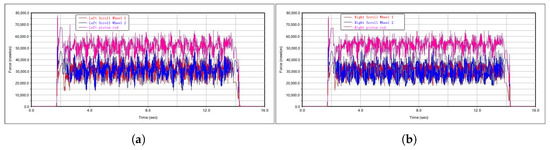 Comparison of the force on the piston rod of the spinning buckle roller–clamping cylinder. (a) Comparison of forces on the left roller set and cylinder. (b) Comparison of forces on the right roller set and cylinder.