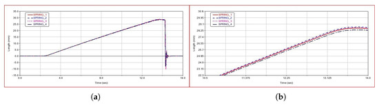 Figure 26b shows the partial enlargement of the axial displacement curve of each spin buckle roller. From the data in the figure, it can be seen that the maximum axial displacement of each spin buckle roller is in the range of 28.34∼28.73 mm, and the maximum relative axial displacement is about 0.39 mm, which indicates that the synchronization of the axial movement of each roller is better; at t = 14.2 s, the work of the spin buckle is finished, and the roller is reset by the effect of gravity, and the spring compression amount reaches 10.38 mm in a short period of time due to the effect of gravity potential energy and quickly returns to the initial value under the influence of damping.