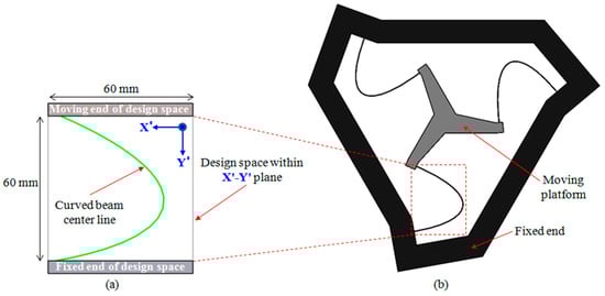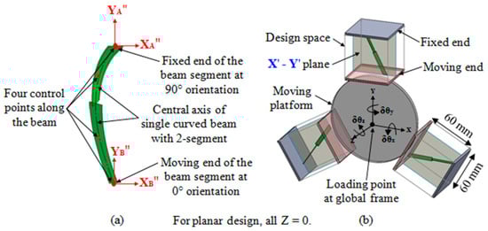 The improved beam-based method reported in [], used to synthesize a single curved beam with two segments having different beam orientations, is shown in Figure 2a. Figure 2b shows a three-legged configuration for a multiple DoF CPM, which is formed by having three synthesized beams equally distributed around a moving platform. The method is able to synthesize a CPM with motion decoupling characteristics, as well as its multiple resonant modes with unique targeted values.