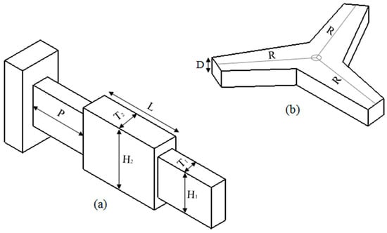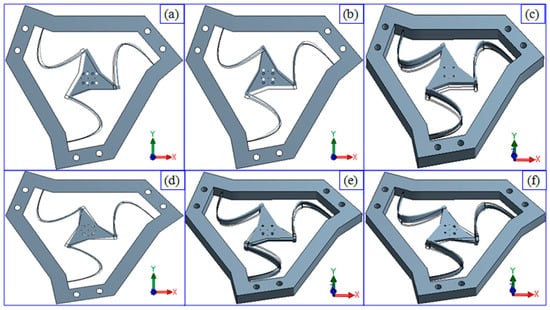 The CPM obtained its optimal size of the leg structure, as shown in Figure 6a. The leg structure consists of a single curved beam, which is made up of two vertical beam segments along the beam on the X’-Y’ plane perpendicularly. The beam segment at the fixed end, without any additional mass, has a cross-sectional area of 0.70 mm × 7.36 mm. The other beam segment at the moving end is with additional mass and has a larger cross-sectional area of 1.75 mm × 10.39 mm. The three-legged 6-DoF CPM, as shown in Figure 6b, is configured by three optimized leg structures, equally distributed around the triangular moving platform. One end of each leg structure is fixed to the base, and the other end is rigidly connected to the moving platform.