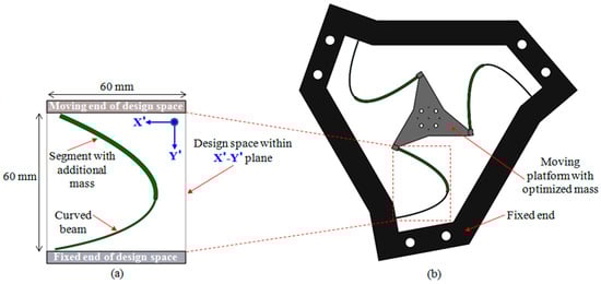The single curved beam obtained from the stiffness optimization, as shown in Figure 3, needs to be further optimized in the dynamic optimization in order to achieve the specified resonant modes. The single curved beam with only two design variables, thickness () and height (), are not sufficient to create the beam geometry that can achieve the design requirement. Therefore, more design variables on the beam are achieved by introducing an additional mass that is located at a suitable position along the beam during the dynamic optimization. The optimal beam design has eight design variables, as shown in Figure 4. They include the mass of the moving platform (R, D), the beam structure (, ), and the position (P) of the additional mass (, , L). Note that the concept of the eight design variables is from [].