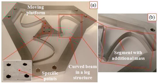 Figure 8a shows the 6-DoF CPM prototype, which is monolithically machined by a combination of wire-cut and CNC milling processes; the prototype is made of aluminum alloy 6061, as designed. Figure 8b shows one of the leg structures of the CPM with a curved beam and additional mass, fabricated based on the optimized design, as in Figure 6a. The dynamic experiment is first conducted to verify the effectiveness of the novel objective function, followed by the compliance experiment to verify the results obtained from the synthesis process. Note that in the experiments, each measurement is repeated five times to ensure the repeatability and reliability of the experimental results.