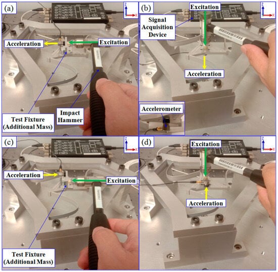Experimental setup of dynamic response at: (a) along X-axis; (b) along Z-axis; (c) about Z-axis; and (d) about X-axis.