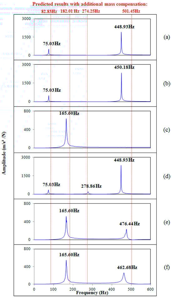 The experimental results of the dynamic responses are shown in Figure 10. Note that the predicted data with the mass compensation presented in Table 5 are marked with vertical red lines, while the blue graphs indicate the measured results from the experiments shown in Figure 9.
