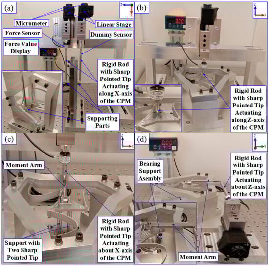 Experimental setup of compliance at (a) along X-axis; (b) along Z-axis; (c) about X-axis; and (d) about Z-axis.
