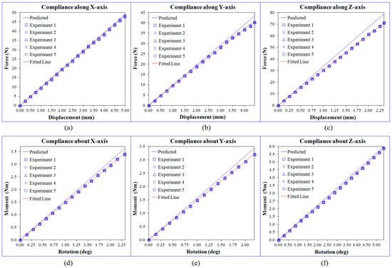 Experimental result plotted against the predicted and FEA at (a) along X-axis; (b) along Y-axis; (c) along Z-axis; (d) about X-axis; (e) about Y-axis; and (f) about Z-axis.
