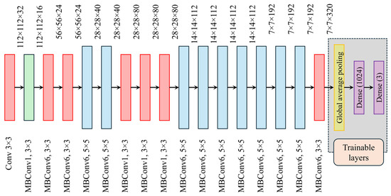 These constants (, , ) determine how additional resources are distributed across network dimensions, while controls the overall scaling. EfficientNet–B0 serves as the baseline model, which is then extended to EfficientNet–B1 to B7 through a two-step process. First, assuming twice the resources are available, a grid search is performed with to find the optimal values for , , and . Second, these values are fixed, and the baseline network is scaled using different values to obtain the larger models. This innovative scaling method allows EfficientNet to achieve superior performance efficiently [41]. This research utilizes the EfficientNet–B0 baseline model, and Figure 2 shows its architectural details. The bottom text in the figure represents the sequence of the MBConv layers, while the text at the top represents the shape of the output feature map after each layer. All layers of the EfficientNet model are initially pre-trained using the ImageNet dataset. Later, the final classification layer of the trained model is removed, and three new layers are added. These layers include a global average pooling (GAP) layer, a dense layer, and another dense layer for classification. The purpose of the global average pooling layer is to reduce each feature map to a single value by averaging, effectively summarizing the feature extracted by the EfficientNet layers. All three newly added layers are trainable, while the previous layer weights are frozen while training on the target vibration scalograms of composites.