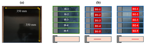 Composite samples manufactured through a hot press compression modeling process using carbon fiber prepreg [0/90/0/90]s were used in this study. Laminated composite plates with dimensions of 350 mm × 350 mm were obtained through this process, as shown in Figure 4a. The developed composites contained three health states: healthy (H), delamination–1 (D1), and delamination–2 (D2). The delaminations were induced in the mid-plane of the composites using a Teflon film. Both delaminations were of identical size (50 mm × 50 mm); however, D1 was closer to the clamped side, while D2 was located closer to the free end of the cantilever beam configuration during experimentation. The delaminations were deliberately sized identically to demonstrate the detection of damage at different locations within the composite structure. This approach addresses the challenge of identifying adjacent damages that may possess similar dynamic characteristics. Moreover, the delaminations with identical size are also easy to produce in laminated composites, facilitating the manufacturing process. Five different samples of each health state were used in the experiments to account for the manufacturing and experimentation uncertainties, as shown in Figure 4b. The edges of the developed composites were rough due to manual layup; therefore, the rough edges were removed. After removing the rough edges, the dimensions of each sample were 300 mm × 50 mm, and five such samples for each health state were obtained to mitigate potential inconsistencies from the manufacturing process, reducing the likelihood of false data and ensuring the reliability of data acquisition.