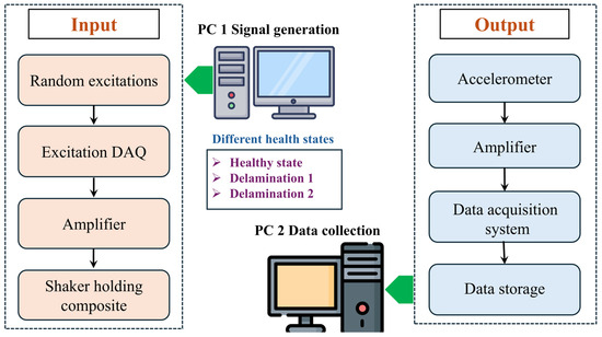 A data collection (DAQ) system, an excitation system, and a vibration system made up the experimental setup. The schematic representation of the experimental setup is shown in Figure 5. For this study, the excitation setup comprised a LabVIEW PC that generated random impulses using MATLAB Simulink 10.0. The random excitations were transported to the shaker by an amplifier and an excitation data-gathering system for the excitation system. Using cantilever boundary conditions, the vibration apparatus applied shaker excitation to the composite specimens that were fixed into the shaker in a cantilever beam configuration. The accelerometer connected to the free end of the composites represented the main component of the DAQ system, which recorded random excitations from three different health states. Additionally, it had a DAQ system to gather the broadened impulses and an amplifier to amplify the collected data. Vibration data were recorded for a period of 15 s from five composite samples, representing all structural conditions, at a sampling rate of 2.5 kHz. Furthermore, 10 stochastic responses were captured from each sample to enhance the dataset diversity. As a result, these 10 random responses, combined with five samples per health state, generated 50 stochastic scenarios for each condition, demonstrating significant variability. The collected data were in the form of a 1D signal, which could be transformed into 2D images. This preprocessing enabled the extraction of discriminative features that assisted in accurately diagnosing various composite health states.