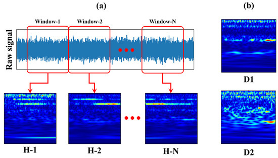 The continuous wavelet transform (CWT) of a signal transforms it into scalograms that are depicted as a time–frequency representation [45]. In contrast to the spectrogram, the scalogram is especially useful for evaluating signals found in engineering applications that have different characteristics at different scales, like slow-moving events that are periodically broken up by sudden transients. This approach enhances time localization for short-duration, high-frequency events and facilitates frequency tracking for longer-duration, low-frequency events. The method involves resampling the signal using a wavelet that is time-shifted and scaled to generate the CWT. Wavelets are known for their oscillatory nature and diverse amplitude values. A prototype wavelet is employed for scalability and transitional operations. The prototype wavelet is dynamically adjusted by the CWT scaling, which stretches and shrinks it. Stretching results in long-duration, low-frequency wavelets that are appropriate for isolating prolonged, low-frequency events, whereas shrinking produces wavelets with short durations and high frequencies, which are perfect for detecting dynamic events [46]. In this study, the CWT was used to transform the 1D data into 2D scalogram images for better learning of the LTL models. Figure 6a shows the windows for the healthy signals and their scalogram images. The length of the signal obtained through a single random response comprised 37,500 data points. The same number of data points were obtained for all five samples of the same health state. Therefore, the total length of a single response signal for all samples of each health state was concatenated to a single signal of length 187,500 data points. This resulted in 100 images using a window size of 1875, without any overlapping. Ten such random responses were obtained for all five samples, resulting in a total of 1000 scalogram images for each health state. A similar process was repeated for the two damage cases, D1 and D2. Example scalogram images for D1 and D2 are shown in Figure 6b. Therefore, a total of 3000 scalogram images were generated, belonging to three health states: H, D1, and D2. The obtained images were then resized to a 224 × 224 pixel size, which is equivalent to the input size required by the LTL models. These scalogram images represent the time–frequency distribution of signals, with color scales indicating energy intensity—warmer colors (red and yellow) signify higher energy levels, and cooler colors (blue) represent lower energy levels. These patterns help identify structural health, where distinct high-energy regions correlate with the presence of damage. Given the controlled setup and consistent patterns, the variations are attributed more to introduced delaminations rather than potential manufacturing defects or experimental uncertainties. To improve the generalization ability of the LTL model, data from six responses comprising 1800 images were used for training, data from two responses comprising 600 images were used for validation, and data from the remaining two responses comprising 600 images were used for testing. This approach ensures that the model is trained on a diverse dataset (from multiple random responses and multiple samples), validated using fine-tuned hyperparameters, and tested on unseen data to evaluate performance accurately. Splitting the data in this manner aims to enhance the model’s robustness and ability to generalize to new, unseen data, which is crucial for reliable performance in real-world applications.