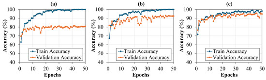 The training curves of the lightweight transfer learning models based on the number of epochs: (a) NASNetMobile, (b) MobileNet, and (c) EfficientNet.