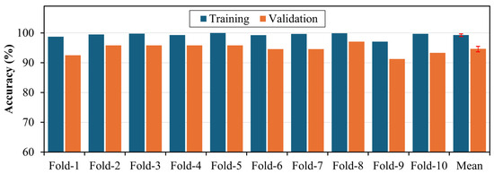 A 10-fold cross-validation strategy validates the generalization ability of the EfficientNet-based model. This approach rigorously tests the performance of the model across different data subsets, minimizing the risk of overfitting and ensuring that the results are not dependent on any specific data split. The results derived from our 10-fold cross-validation are shown in Figure 8. It can be observed that the training and validation accuracies are consistent among all folds. The mean accuracies for 10-fold are shown in the last columns, indicating training and validation accuracies of (99.30 ± 0.82)% and (94.67 ± 1.72)%, respectively. The low standard deviation in both training and validation accuracies indicates that the performance of the model is stable and reliable across different data splits. This further confirms the robustness of the EfficientNet-based model for SHM applications.