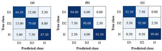 To ensure a better evaluation of the LTL models, they were evaluated on unseen test datasets using the assessment metrics mentioned in Section 2.3. The evaluation of unseen data is useful for determining the model’s capacity for generalization. Additionally, if the performance of the trained model on the testing set is noticeably worse, this suggests overfitting to the training set. The NASNetMobile, MobileNet, and EfficientNet models showed testing accuracies of (83.67, 92.50, and 94.50)%, respectively. Figure 9 displays the confusion matrices (CMs) for the three LTL models. A CM is a tabular representation of a classification model’s predictions, where diagonal terms indicate correct classifications (Tp and Tn), while off-diagonal terms denote incorrect classifications (Fp and Fn). The diagonal cell values of the NASNetMobile model are reduced, suggesting inefficient classification of all health states (particularly D2). Furthermore, for damaged states D1 and D2, the model shows higher values in the off-diagonal cells compared to the diagonal cells. This reflects that even though the health state is classified with better accuracy overall, it is still confused with D2. The MobileNet model showed better accuracy in classifying each health state compared to the NASNetMobile model. The EfficientNet model showed very high accuracy in identifying healthy states (99.00%), while damages D1 and D2 were classified with accuracy values of (92.50 and 92.00)%, respectively. However, note that the EfficientNet model showed more consistent results for classifying the damage states compared to the other LTL models. Due to the nature of the same-sized damages present in the composite laminates, there still exists confusion in identifying D1 and D2, but there are fewer misclassified instances for the damage states compared to the NASNetMobile and MobileNet models. This confusion is due to their identical sizes and adjacent locations, which likely result in similar dynamic characteristics. This overlap in the dynamic characteristics is reflected in the scalogram images, where some common high-intensity regions are present for both D1 and D2, contributing to the misclassification between these states.