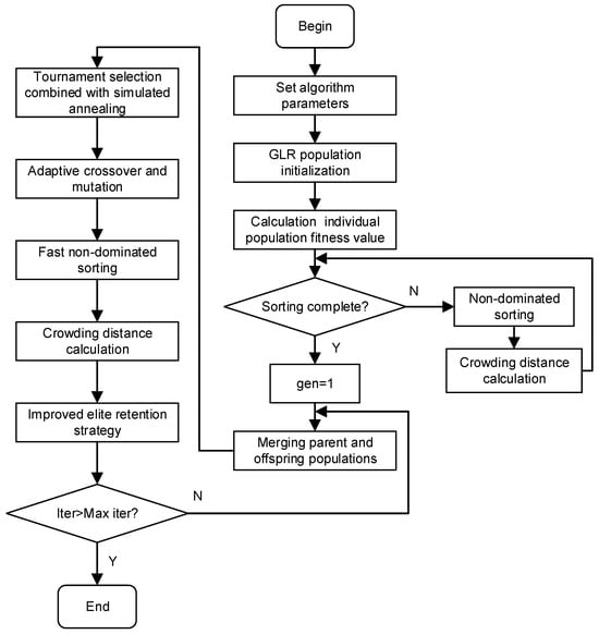 The NSGA-II algorithm is an improved genetic algorithm based on Pareto-optimal solutions, with the goal of resolving multi-objective optimization issues. In order to improve the operational efficiency and optimization capability of the algorithm, this paper proposed an ASA-NSGA-EE algorithm, which will improve the NSGA-II algorithm in three aspects, tournament selection, elite retention strategy, and crossover and mutation, as shown in the ASA-NSGA-EE basic flow in Figure 1.