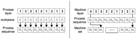 In this paper, we use a two-layer real-number encoding method. In the process layer encoding, different encoding values represent different workpieces. The same workpiece’s different processes are represented by the same value, and the sequence and frequency of the same encoding value indicate the process order of the workpiece. In the machine layer encoding, each gene value represents the machine number selected for the corresponding process in the set of processing machines. For instance, in Figure 2, the first number 4 in the machine layer indicates the machine number in the optional machine set for its corresponding process. Compared to other encoding methods like permutation or discrete encoding, this approach reduces decoding complexity and errors, making it more adaptable to flexible job shop scheduling problems of varying scales and complexities, while maintaining robust performance under challenging scheduling conditions. For instance, in Figure 1, the first number 4 in the machine layer indicates that its corresponding process is processed by machine number in the optional machine set . The last number 3 indicates that its corresponding process is processed by machine number in the optional machine set .