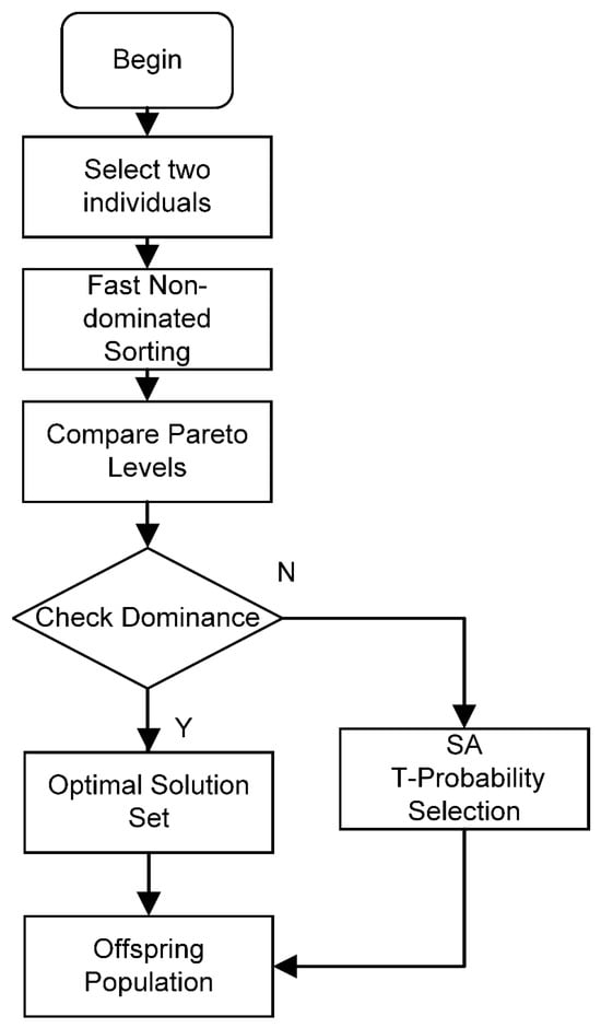 The selection operation involves selecting some superior individuals from the current population to enter the next generation, an important step to promote the evolution of the solution set. Generally, the binary tournament selection method is used, but this method has limitations such as a lack of diversity and difficulty in retaining excellent individuals. Thus, in this paper, we introduce an improve elite selection strategy combined with the Metropolis criterion into the general binary tournament selection. In the early stages of algorithm iteration, solutions with lower-quality are retained with a higher probability to increase population diversity. In the later stages, higher-quality solutions are retained with a higher probability to accelerate the convergence of the population. When the fitness values of two individuals cannot determine the dominance relationship, a temperature-controlled selection pressure is used, still allowing for a certain probability of selecting better individuals. This achieves a dynamic balance between diversity and convergence. The specific process is shown in Figure 3.