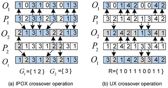 The crossover process for operation codes uses IPOX, as shown in Figure 4a. The specific steps are as follows: randomly select two individuals from the parent population and designate their operation codes as Parent 1 and Parent 2. Then, randomly divide all workpieces into sets and . While maintaining their positions, copy the genes from Parent 1 that are in to Offspring 1 and the genes from Parent 2 that are in to Offspring 2. Then, sequentially place the genes from Parent 1 that are in into Offspring 2, and the genes from Parent 2 that are in into Offspring 2, thus completing the generation of the offspring.