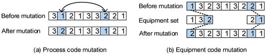 A double-gene mutation method is used for equipment code mutation. Two genes in the parent equipment code chromosome are randomly selected, and then another machine is chosen from the optional equipment set for the mutation operation, as shown in Figure 5b.