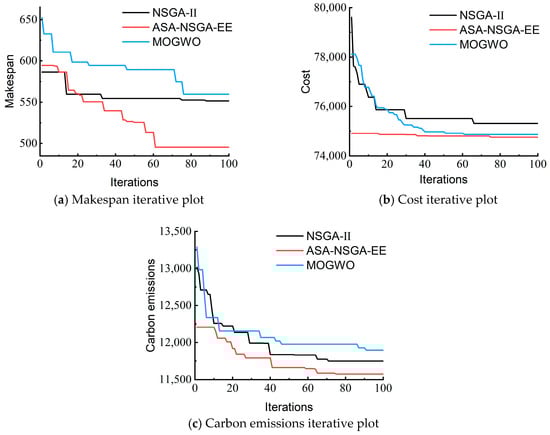 Under the same parameter settings, the three algorithms were run, and the convergence curves of each optimization objective were plotted, as shown in Figure 6. It can be seen that the ASA-NSGA-EE algorithm proposed in this paper achieved the optimal values for makespan, production cost, and carbon emissions. Additionally, it converged to the optimal solution more quickly, verifying the reliability of the proposed algorithm.