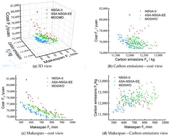 From Figure 7a, it can be seen that the gear shaft scheduling problem studied in this paper does not have an exact solution but rather a Pareto front composed of a series of discrete solutions distributed along the Pareto-optimal frontier. To more accurately determine the correlation among the optimization objectives, three 2D scatter plots from different perspectives were drawn. Figure 7b shows that the solutions obtained by the ASA-NSGA-EE algorithm are more diverse, achieving lower carbon emissions and processing costs. Figure 7c indicates that as the completion time increases, the processing cost decreases, and the convergence effect is superior to that of the other two algorithms. Figure 7d shows that the ASA-NSGA-EE algorithm can find shorter completion times and lower carbon emissions.
