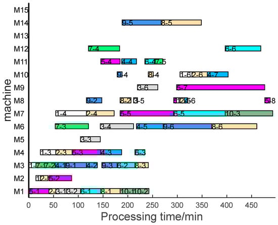 In summary, under the same parameter settings, the solutions obtained by the algorithm described in this paper are of higher quality across all objective dimensions. Additionally, a Gantt chart for gear shaft scheduling generated by the ASA-NSGA-EE algorithm is provided in Figure 8.