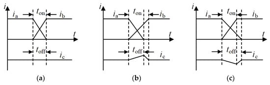 Influence of duty ratio D on the three-phase current in the medium-speed stage: (a) D = 50%; (b) D < 50%; (c) D > 50%.