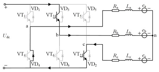 The upper-tube commutation process from A+C− to B+C− is used as an example of the analysis. In Figure 3, VT1 is turned off, VT3 is turned on, VT2 remains constant, and VD4 freewheels. Ignoring the on-voltage drop of the switch tube and the freewheeling diode, the three-phase voltage meets Ucn − Uan = 0, Ubn − Ucn = sUdc, and the three-phase current meets ia + ib + ic = 0. According to (1), the voltage during the turn-off phase and the turn-on phase can be obtained as: