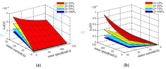 The relationship between the turn-off phase freewheeling duration, the turn-on phase rising duration, the duty ratio of the Zeta converter, stator current, and rotor speed: (a) the turn-off phase freewheeling duration; (b) the turn-on phase rising duration.