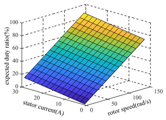 When the speed and current are fixed, the Udc can be obtained as (9), and the expected duty ratio D of the Zeta converter can be obtained as (10), by taking toff = ton as the condition of no commutation torque ripple, according to (3) and (8). The corresponding 3D graph is shown in Figure 5.