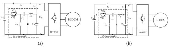 The stator winding of the BLDCM adopts a three-phase star connection method. Due to the existence of motor inductance and the impact of the motor speed, current, and conduction mode, the turn-off phase freewheeling duration is not equal to the turn-on phase rising duration, resulting in commutation torque ripple [,]. Therefore, the output voltage is controlled by adding the Zeta converter at the front end of the three-phase inverter, so that the conversion rates of the turn-off phase and turn-on phase currents are equal during commutation. Figure 1 displays the equivalent model of the driving circuit topology and the motor.