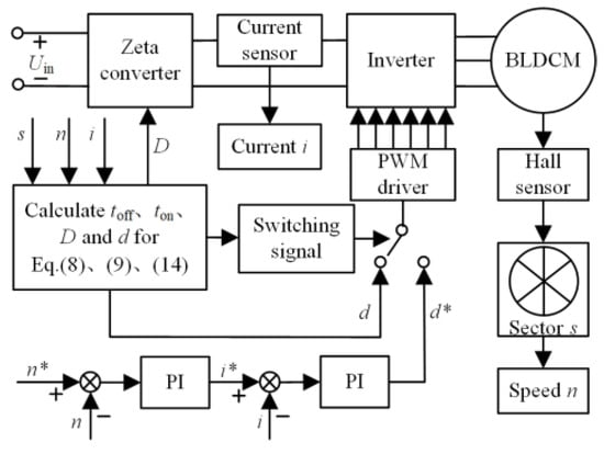 On the basis of the above analysis, the BLDCM control system is designed. Figure 9 shows the configuration of the proposed BLDCM control system. The working status of the motor is judged by the Hall signal. If the motor works in the noncommutation region, the system uses double-loop PI regulators to control the stable operation of the motor. If the motor works in the commutation region, on the basis of the Zeta converter output voltage adjustment after the previous commutation, the commutation time and the duty ratio of the inverter are calculated according to (10) and (15) to suppress the motor commutation torque ripple. At the end of commutation, the expected output voltage of the Zeta converter is adjusted according to (10) to ensure that the Zeta converter can output a stable expected voltage at the next commutation.