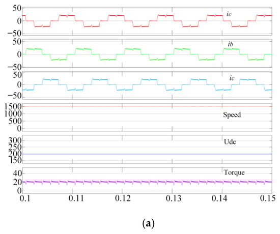 When the motor runs in the noncommutation region, the S1 is turned on and the S2 is turned off, Udc = Uin. During that time, the BLDCM drive system is controlled with traditional double-loop PI regulators (i.e., the speed loop and the current loop), and the speed and torque can achieve high stability, such as in Figure 8a. At the same time, the Zeta converter is disconnected from the inverter circuit and adjusted according to (10) to achieve stability.