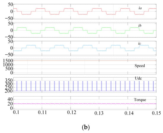 Simulation results, with the torque reference value being 20 N·m and the speed being 1500 r/min: (a) traditional control strategy; (b) proposed method.