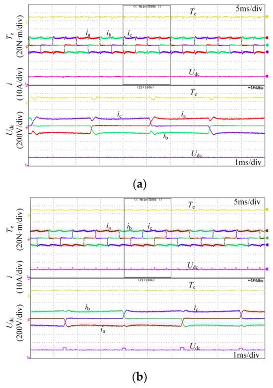 Experimental results, with the torque reference value being 10 N·m and the speed being 1000 r/min: (a) traditional control strategy; (b) proposed method.