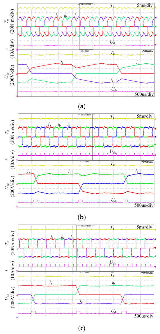 Experimental results, with the torque reference value being 20 N·m and the speed being 1500 r/min: (a) traditional control strategy; (b) control strategy in []; (c) proposed method.