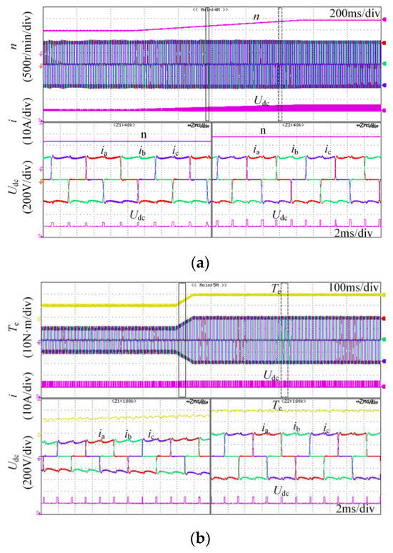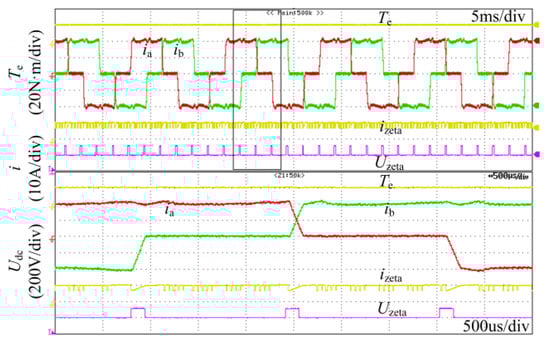 Figure 12 shows the experimental results when the motor runs at the torque reference value of 10 N·m and a speed of 1000 r/min. Figure 12a shows the experimental results for the traditional double-loop PI. The value of Kr is higher than 30%. Figure 12b shows the experimental results for the proposed method based on the Zeta converter. The value of Kr is less than 15%. Compared to traditional methods, the commutation time of the proposed method has also been significantly reduced, as shown in Figure 12.
